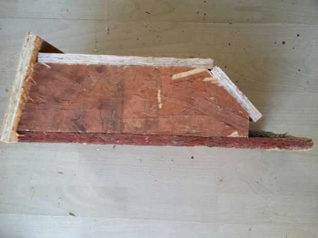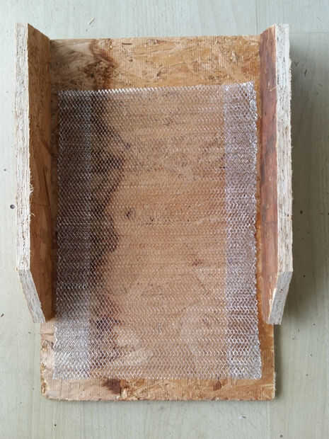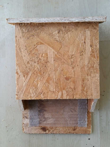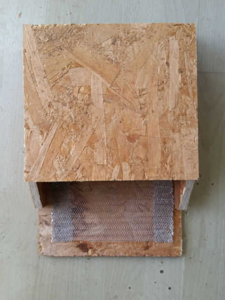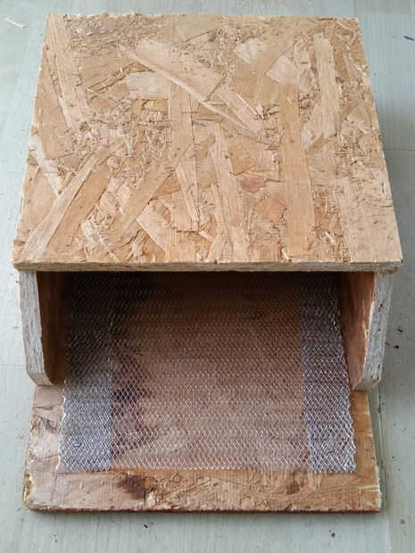 Primero los dos lados del clavo y clavo entre el alambre de la malla. Luego el frente, el techo y la tapa inferior. Por último, la pieza larga detrás de él para colgar/fijación.