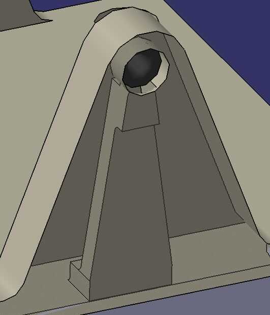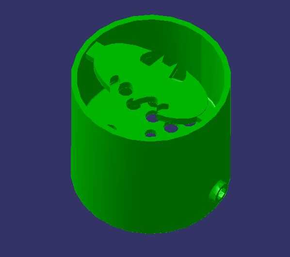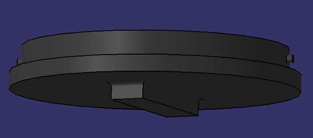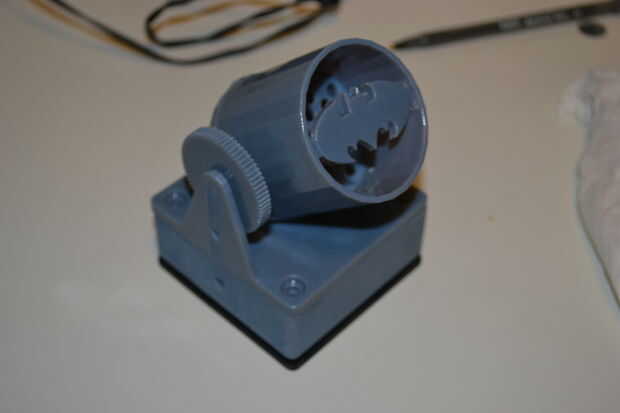 Atornillados a la base es la tapa, que incluye los soportes para el cañón. El soporte más grueso en la derecha tiene un pase a través de los cables de corriente de los LED a la batería y un agujero en aburridos para el árbol. El apoyo izquierdo tiene dos agujeros recta, la parte superior para el engranaje más grande, el más bajo es donde la marcha inferior y el mango. El eje en el apoyo de la mano derecha tiene un agujero por donde pasar los cables de los LEDs a través de medio.