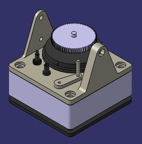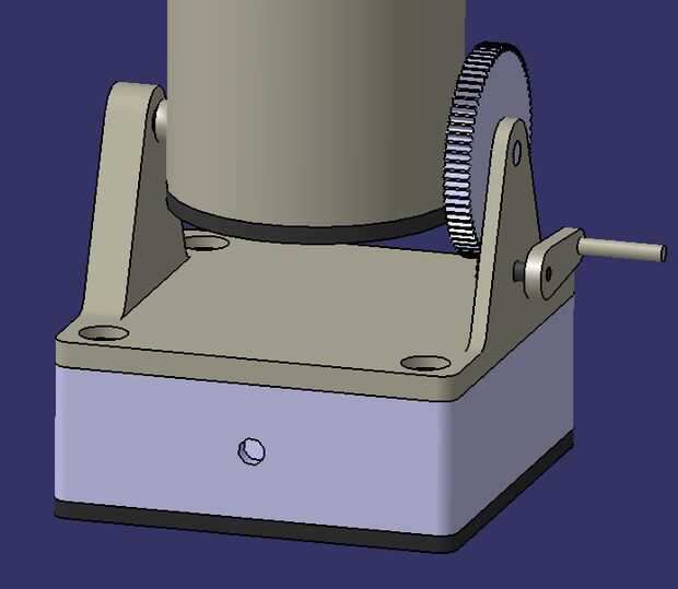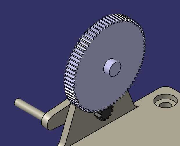 El engranaje grande en la parte superior se fija al cañón mientras que gira libre en el soporte. Tiene un 1.5" diametro 48 pitch (72 dientes) y un ángulo de presión de 20 º. El engranaje inferior giros gratis en el soporte y se une al mango. Tiene un diametro de. 25" pitch 48 (12 dientes) y un ángulo de presión de 20 º. La relación de transmisión es de 6:1 desde la perspectiva de allí (6 vueltas de la manija se convertiría el cañón una vez).