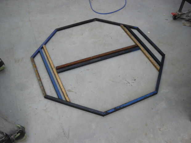 D: 2 Puntales de tambor a 562mm menos el espesor de las placas pequeñas de metal enumeran en materiales (mina fueron 3mm de espesor), Plaza de la cortes a 90 grados
