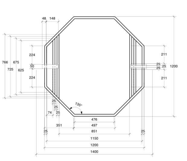 R: 8 base exteriores a 497mm a lo largo del borde más largo, cortes que se inclinan en 22,5 grados cada