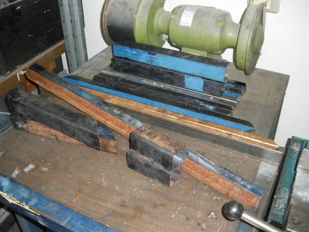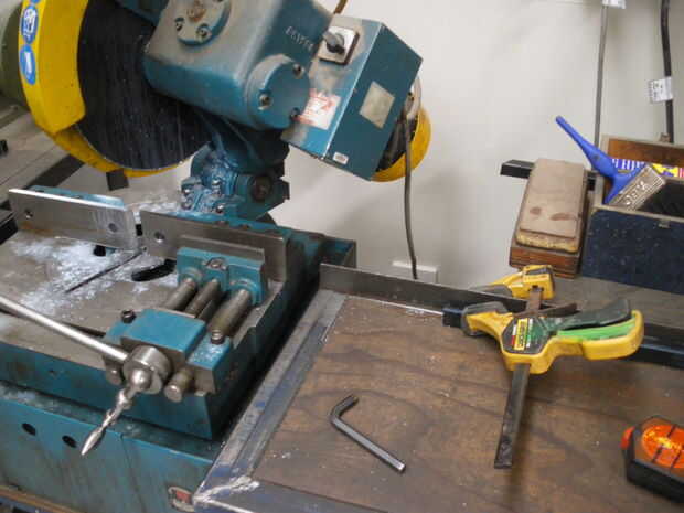 Mis dibujos eran bastante precisos, por lo que he trabajado lentamente, medición de ángulos y longitudes dos veces antes de cada corte. Para cortar, utilicé una sierra de corte en frío estacionaria, una sierra circular que corta lentamente a través de metal mientras se baña la cuchilla y el material en un fluido lubricante que mantiene el material y la cuchilla slick y cool. Es esencialmente una sierra de cortar metal, bien con cortes rectos, nivel, repetibles a través del acero y otros metales. Puesto que todas mis piezas son duplicados de otros, configurar plantillas para cada longitud. Para ello, con abrazadera acero chatarra a pista de la sierra para detener los tubos de acero a una distancia específica de la hoja (véase el cuadro por ejemplo). Usted puede averiguar lo que se necesita de los dibujos que adjunto a este instructivo, pero para simplificar, la lista de corte es el siguiente: