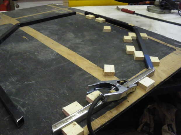 Afortunadamente, la base es una forma regular, por lo que puedes hacer una plantilla para las dos juntas y gire la base alrededor de entre las soldaduras. Así que para hacer esto, dibuje hacia fuera tres piezas del Octógono debe teóricamente unirse en su mesa de trabajo (o, idealmente, en un pedazo de madera contrachapada para más adelante no char su mesa de trabajo mientras se está soldando) (también, utilizar una regla/transportador y no a mano alzada), luego colocar tres piezas en el dibujo, colocándolos juntos firmemente para poner a prueba su dibujo teórico. Luego atornille pequeños bloques de madera alrededor de las piezas que los bloques firmemente mantener tus piezas todos juntos. Asegúrese de dejar espacio alrededor de los empalmes entre piezas por lo que se puede tener acceso a soldar. Con los bloques en su lugar, agregue dos de los puntales que caben dentro del hexágono y añadan bloques de fijación para ellos. ¡ Listo!