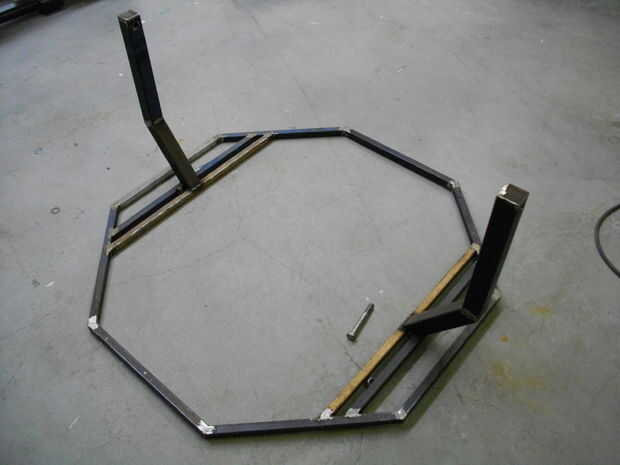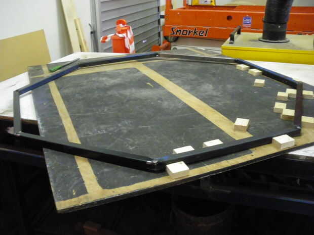 Una vez que todo es plano, entonces completamente puede soldar los empalmes. No funcionan directamente alrededor en un círculo, en cambio alternativo en su interior, exterior y superior, omitiendo algunas articulaciones cada vez. Una vez más, la idea es para que extienda las deformaciones que no proa todo con demasiado calor que se concentró en cualquier lado. Una vez que estés satisfecho con un octágono completado y soportes interiores, moler abajo de las soldaduras en la parte inferior para que se pone plana sobre una superficie dura sin balancearse.