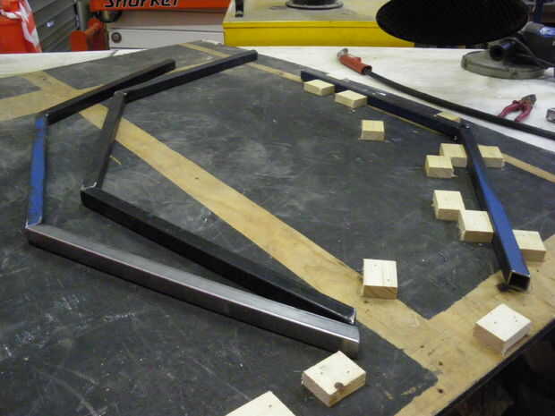 Sin embargo, diré algunas cosas aplicables a este proyecto que aprendí que funcionó bien para mí. En primer lugar, sabemos que deformación por calor es el enemigo absoluto, especialmente ya que queremos que el octágono para sentarse sobre el piso. Así que en lugar de uno empalme de la soldadura completamente, luego la siguiente, luego la siguiente todo el camino alrededor, soldar el octágono juntos, solo dos o tres tachuelas por trabajo conjunto, para crear unas pocas piezas de lado múltiples, que usted luego se unen al final. Por soldadura de tachuela, me refiero a un solo punto de ventaja entre piezas de soldadura. Esto ayudará a su forma y conectando sólidamente las piezas antes de acumular tanta calor que deforman la pieza. Entonces, con toda la plana base Junta (todos los 8 lados y los cuatro pedazos interiores), compruebe que es plana. Probablemente no será, así que ajuste las articulaciones por golpear con un mazo o bien recoger el marco y luego tirarse las articulaciones torcidas hacia abajo sobre la mesa.