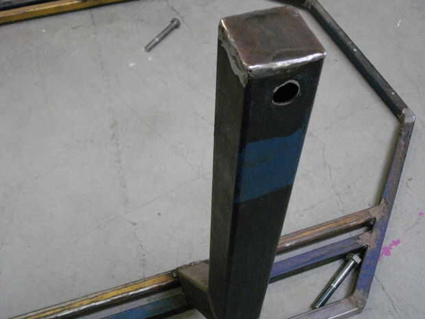 Siguiente es soldar el tubo cuadrado de 50mm para hacer los brazos laterales de la base. Es bastante sencillo. Una plantilla no debería ser también necesaria para la articulación simple, sujete cada pieza a la mesa en su lugar virar algunos puntos sobre la articulación y soldarlo sólido. Terminar con tachuelas y los brazos en el centro de los soportes del interior del Octógono (como se ve en el dibujo) de la soldadura y soldar una placa de metal de 50 x 50 mm tapa en la parte superior de cada brazo (o utilizar tapas de plástico que encajan en los extremos).