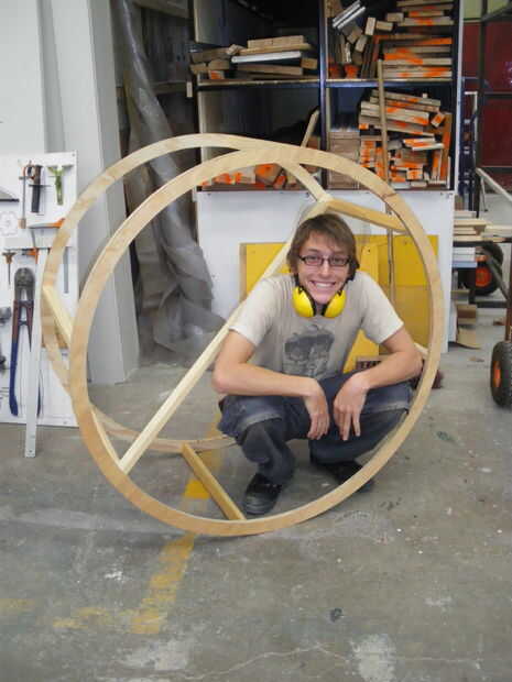 Cuando termine, añadir el pedazo de la Cruz-apoyar que usted preparado en el paso 6 entre dos puntales de madera enfrentadas. Esto le ayudará a mantener las cosas cuadradas para pelar. Ahora rodar la cosa alrededor de su espacio y admirar cómo bien rollos! Cuidadosamente has inventado una rueda de madera!