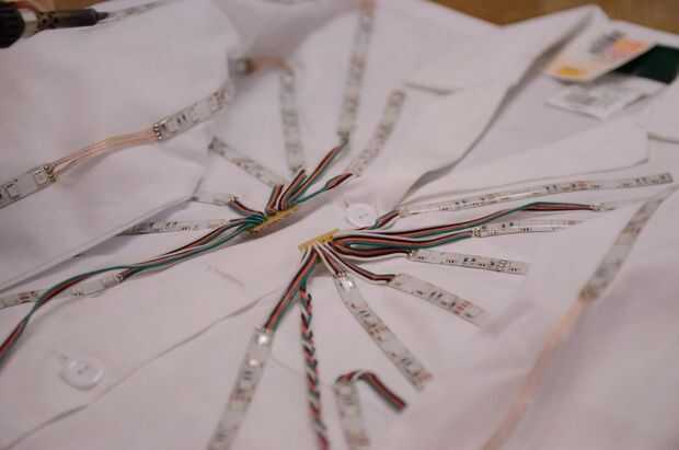 A continuación, tira de los extremos del cable y de la soldadura con cuidado cada uno de los cuatro conductores de las cuatro almohadillas de contacto en la tira de LED. Repita para cada tira. Ser coherente acerca de cual cable de color se conecta a que pad. Tómese su tiempo y si la soldadura se derrama sobre un bloque vecino, cuidadosamente arreglarlo.