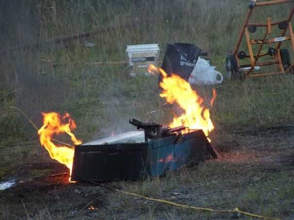 Nuestros eran básico anclaje controlado sobre coches eléctricos de tamaño. Utilizando cientos de pies de amarres guardó nuestros robots baratos y confiables. Ambos trabajamos en un molino donde teníamos acceso a longitudes largas de cable blindado cada cables de 16 que contienen. Un montón de combinación alambre para conducir nuestros robots. Utilizando amarres también permitió mantener las baterías de 24 voltios en las cabinas de control, negando el peso adicional en los robots reales. Gas de Pablo alimentada lanzador de la llama era simple zip atado a una longitud de tubería para su anclaje en el gas de alimentación. En su stand de control tenía 10 galones tambor de gas que alimenta el tubo. Utilizando amarres también nos ha permitido hacer estos golpes luchas en barato, no costoso reguladores u otro hardware que no desea ver que tostado, literalmente.