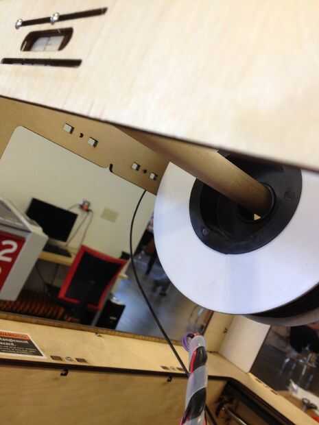 Aquí después limpié la boquilla yo soy realinear el PLA poniendo sobre la espalda y bajo mantenerlo alineado con la boquilla de impresión. Esta elección se basa en la máquina real como sólo 1 de las 2 máquinas disponibles en el TechShop tiene el diseño para el PLA ir hacia arriba y sobre la espalda con corte en la madera de linign para arriba un poco de espacio.