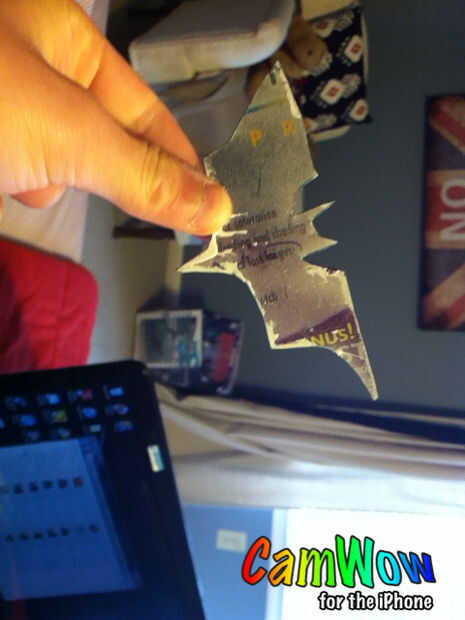 Obviamente, CÓRTELO hacia fuera!!!!!! DUH! Una vez listo que debe parecerse a la foto. Lije los bordes antes de pintar. Si arena después de pintar puede liberar plomo en el aire y el plomo es tóxico. Enderece el Batarang por recorte a algo recto o martilleo plano.