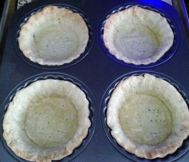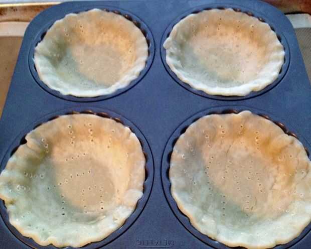 Hornear pasteles mini durante 15 minutos, girando a la mitad de la cocción del pan. (Si para hornear un pastel de 9 pulgadas probablemente tardará 20-25 minutos) Buscas la costra y se dore ligeramente, si las partes han inflado, aplanar con un tenedor. Retirar pesos de la empanada y dejamos reposar.