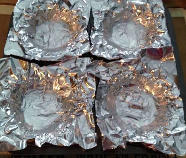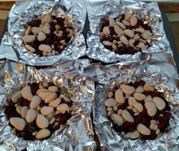 Preparar empanadas para hornear en ciego por meter la masa fría con las púas de un tenedor en muchos lugares. Cubrir la masa con papel de aluminio (yo prefiero papel antiadherente), agregar frijoles secos o pesas de pie.