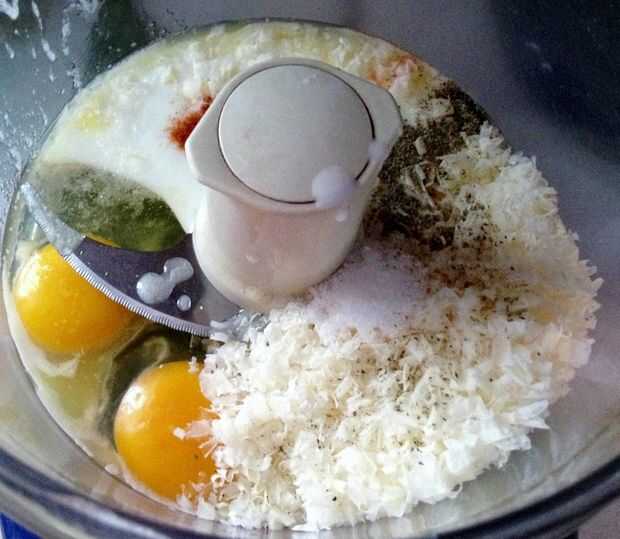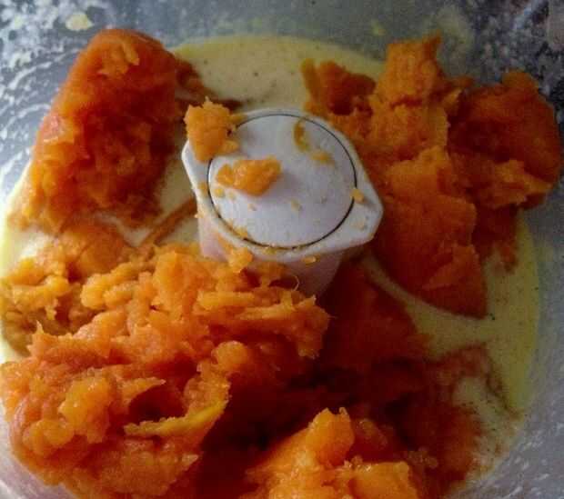 En un procesador de alimentos combinar huevos, suero de leche, mantequilla derretida, queso parmesano, sal, pimienta y Cayena. Mezcla hasta combinar, unos 5 segundos. Raspar la carne de las patatas dulces en procesador de alimentos y mezcla hasta que esté suave, aproximadamente 30 segundos. Si usted se siente cómodo huevo crudo sabor, probar y ajustar sazón.