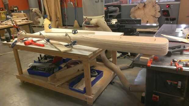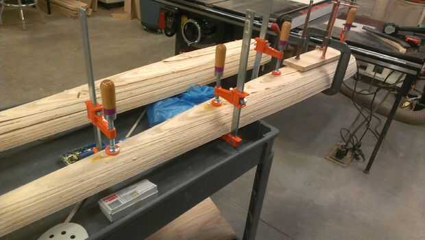 Cada vez que pegue una capa de madera contrachapada, fijarlo con la abrazadera, luego dispara sobre brad de 15-1 3/8" clavitos en el layers.using un aire con clavadora.
