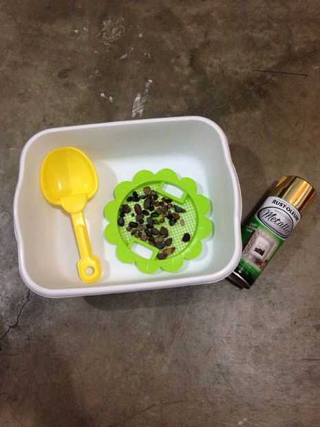 He utilizado pequeñas rocas de nuestro patio. No se olvide de lavarlos. Un plástico probarlos y arena juguetes de la tienda del dólar (Dollar Tree), jugar arena (bolsa de 50 libras por $5) y pintura de aerosol metálica oro (Rust-Oleum) de Home Depot (Home Depot).