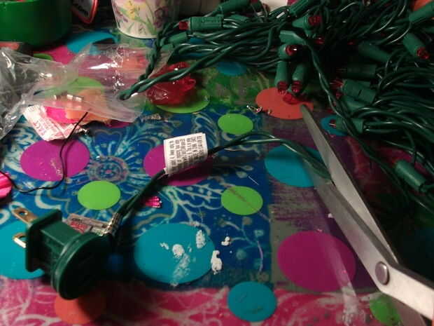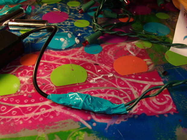 Cortar el enchufe y la faja alrededor de una pulgada o menos de las cosas del aislamiento del alambre. Luego conecte los cables a la caja de la batería por les soldadura o torcerlos juntos. Si usted tuerce ellos juntos ponga cinta para conductos poner cinta alrededor de los dos cables por separado y luego poner cinta alrededor de ambos. Y ahí lo tienen! Luces de Navidad LED con pilas!