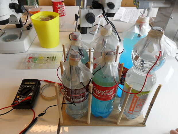 y zinc al alambre oscuro y en el otro de cobre final. se inicia en la primera botella con el cobre y el extremo en la botella siguiente (zinc) en la segunda botella que vuelve a iniciar con un rojo cable este fin de wil en la siguiente botella y allí empiezas otra vez con un cable negro. Esta wil crear un circuito eléctrico.