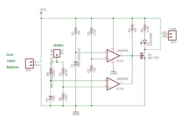 Z2 se supone que es una 1,8 zener. Que junto con R6, R7 y R8 realizar una comparación similar para el punto medio. Se trata de un cable conectado entre las dos pilas en el soporte.