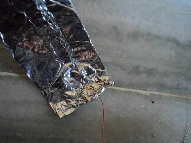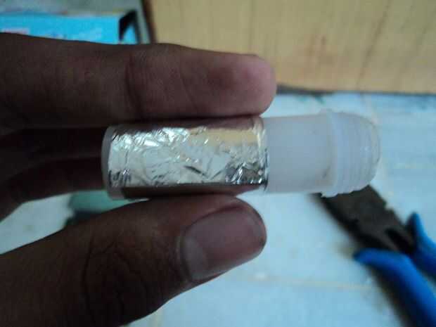 Ahora necesitas un pedazo de papel de aluminio que debe rodear el contenedor desde dentro pero en tal esa posición que no debe hacer que la varilla de carbono en contacto con él. Para ello en primer lugar cortar un trozo cuadrado de papel y luego hacer una tira rectangular y luego hacer que ruede alrededor del cuerpo fundido en sus dimensiones y pasemos al siguiente paso.