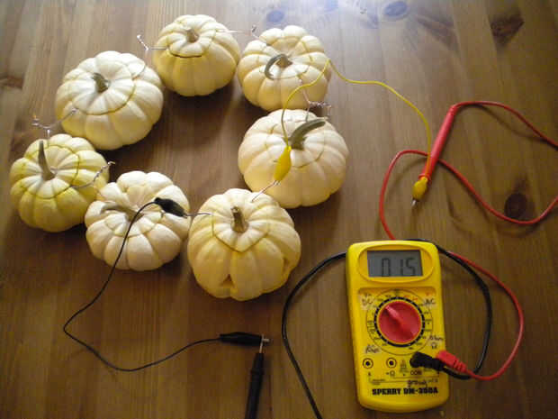 Puede comprobar la tensión colocando un clip de alambre de aluminio para la sonda de tierra de un multímetro y un clip del alambre de cobre a la sonda de alimentación. Ajuste el multímetro para detectar DC y verá que la salida de los botes de calabaza es de 1,5 voltios.