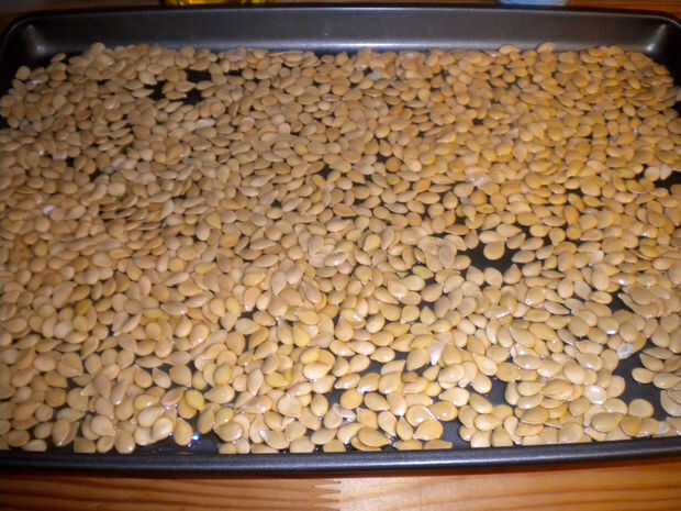 Tomar las semillas de calabazas y las tripas y colóquelos en un recipiente llenado de agua. Las semillas flotarán en la parte superior de una presa fácil. Separar las entrañas de las semillas y extender las semillas en una bandeja para hornear galletas. Dejar la hoja seca durante la noche.