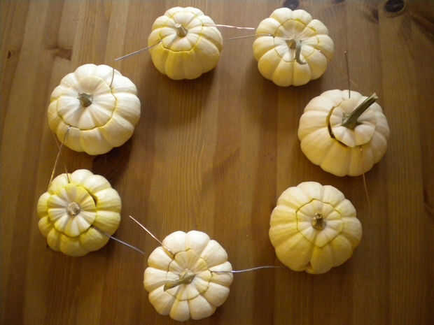 Formar un círculo con las calabazas que un alambre de cobre de uno con un alambre de aluminio de otro. Retire las tapas de dos calabazas y firmemente tuerza los cables de cobre y aluminio por lo menos tres veces. Repita este paso para todas las otras calabazas y antes de unir los dos cables.
