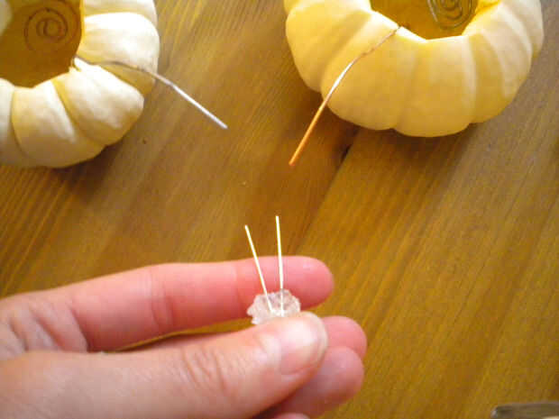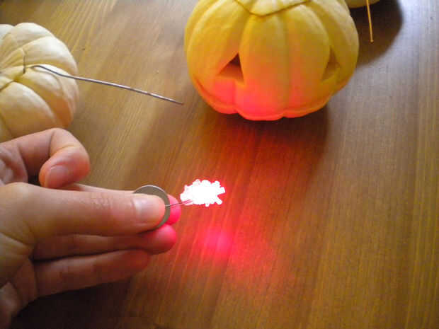 Tomar el LED y pruébelo para asegurarse de que funciona con una batería de botón 3V. No tienes que hacer este paso si no tienes una batería pero no duele para asegurarse. El LED que he utilizado ha sido confitado con cristales de azúcar-se difunde mejor la luz y hace que para una divertida adición al proyecto temática de Halloween. Las patas del LED son diferentes longitudes - la pierna más larga se torció alrededor del alambre de cobre y la pierna más corta se torció alrededor del alambre de aluminio.