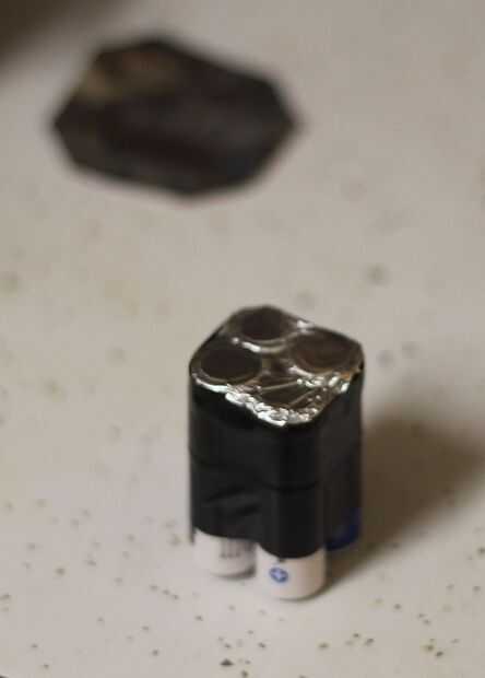 - Cinta 4 AA's por el medio para mantenerlos como se muestra. Asegúrese de que sus contactos están en las alturas del mismo para asegurarse de que hacen contacto eléctrico en los dos pasos siguientes.