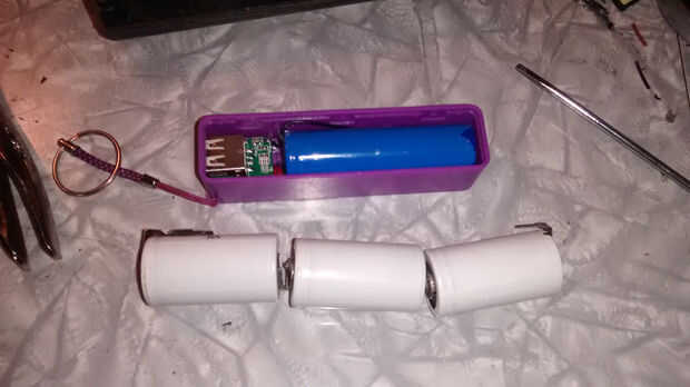 La clave para el reemplazo era la disponibilidad de dispositivos baratos de "Banco de energía" de la tienda local del dólar. Pude escoger uno por $3 (canadiense) y funciona, aunque mal. El problema es que la célula es probablemente un rechazo de un segunda ejecución batería fabricante, por lo que apenas da la mitad un cargo en mi teléfono antes de muera. El circuito funciona sin embargo, y esa es la parte que voy a utilizar.