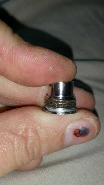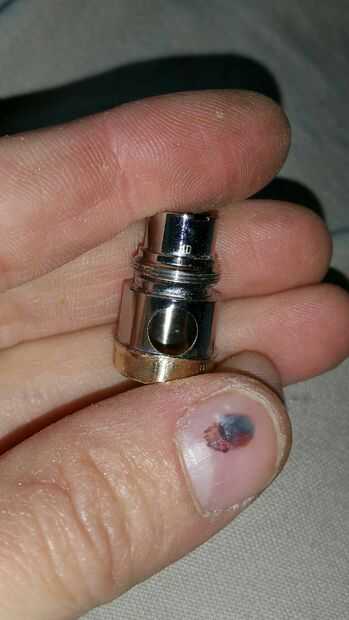 Mi conector 510 {esto es y batería de Ecig regular mina era se rompió. Si no tienes uno puede solicitar uno de anazon.com o tu tienda local vape debería tenerlas.} tuvo que ser afeitado abajo pasa el agujero donde estaba el botón original. Cortó derecho por encima del agujero haciendo un fondo al ras para esto usé mi Dremel y alicates. Una vez más y Dremel no es un juguete. Esta herramienta puede ser peligrosa incluso para alguien bien experimentado para uso extremadamente cuidado y precaución. También, protección, protección!!!!!! Utilice un disco de corte y corte luego le dan un pequeño grifo y hacer suave. {Si no tienes una Dremel una sierra trabajo puntuación alrededor primero luego cortará. Se necesita para la parte inferior de la arena o para frotar en cartón corrugado hijo para eliminar las rebabas de metal.}