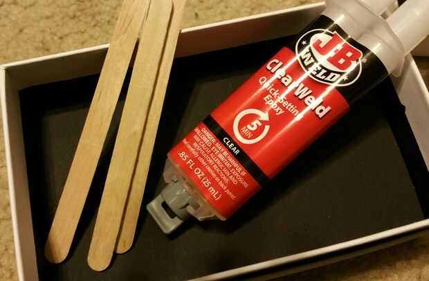 En este paso usando el JB Weld Epoxy, algunas pinzas, cinta aislante, algo para mezclar el epoxi con y también recomiendo unos guantes de goma pero no es necesario. {Epoxy tiene gases pesados y debe usarse siempre en áreas bien ventiladas. Este epoxi establece en 5 minutos que significa asegurarse de que esté listo con todas sus piezas y materiales a la mano antes de mezclar el epoxi. Trabajamos con piezas pequeñas así que un poco va un largo camino por eso utilizo palitos para extender una pequeña cantidad ya que es todo lo que se necesita. }
