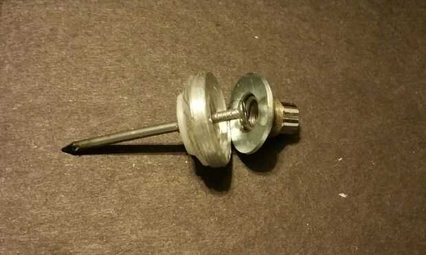 -Después que se haya secado, tomar la pieza 510 conector que hicimos en el ultimo paso con las arandelas. Centro de esta pieza directamente sobre el clavo, asegurándose de que el conector 510 toca la cabeza del clavo/tornillo. Pedazo de epoxy la 510 a la pieza de uñas no asegurándose de que epoxy entra en el los lados de la arandela de la linterna. Usted tendrá que aplaudir suavemente los bordes y otra vez dejar de lado que se seque. Ajustar este tiempo será necesario curar no sólo que significa alrededor de 12 horas de tiempo de secado.