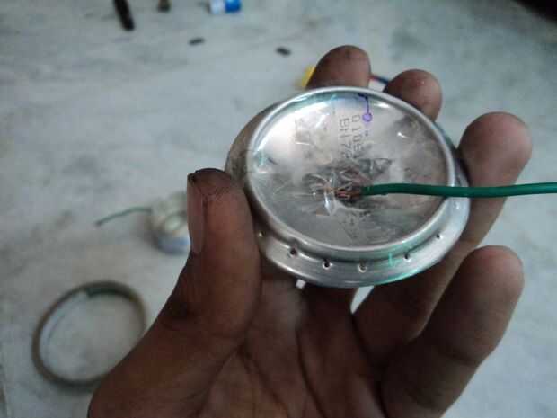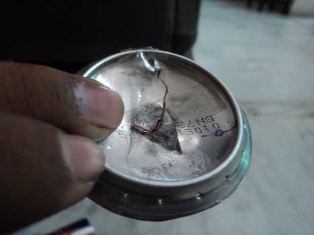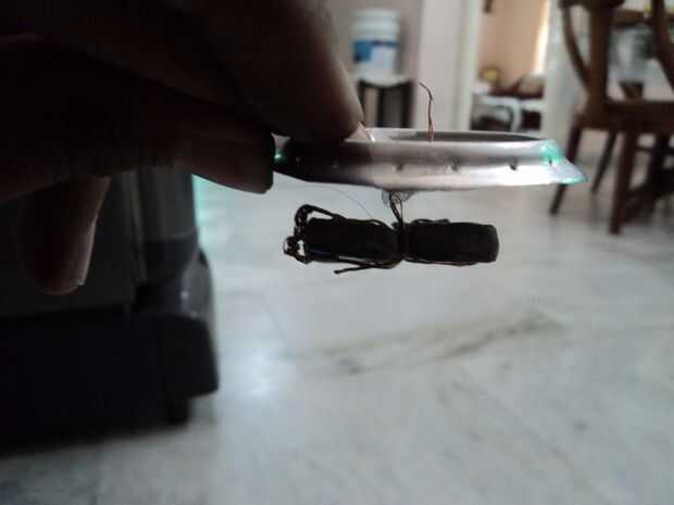 Pasar el alambre de cobre del aislamiento de la cinta de conducto y el pack de dos segmentos de carbón debe colgar, no tocar ninguna parte de la can, excepto aislamiento de cinta del conducto.