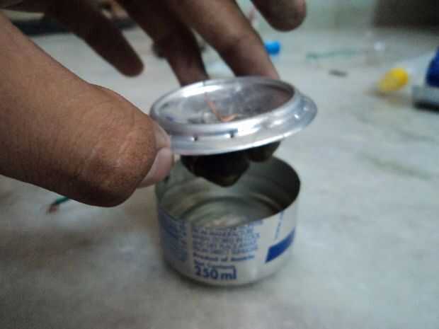 En esta pila, el ánodo se puede sí mismo, así que pasar el cable de poder a través del orificio perforado anteriormente en el paso 4. Ahora es el momento para lanzar el cátodo dentro del ánodo. Después de verter poco de vinagre en la soda puede poner el carbón colgante de segmentos en la parte inferior y sello toda la instalación con cinta para tubos o caliente pegamento y la batería está lista!!!!