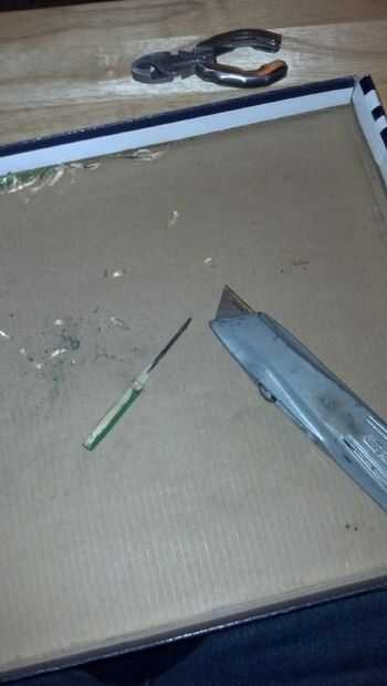 Primero empezar por el afeitado el lápiz hacia abajo para llegar a la punta. He utilizado un cuchillo para hacer esto, pero hará cualquier cuchillo.
