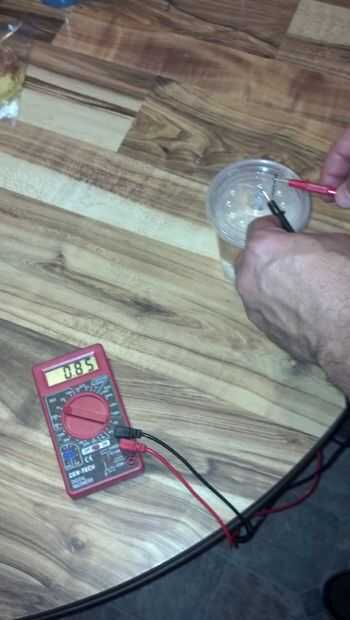 Cuando se prueba la "batería", produjo sobre 0.85v. Esto es un poco más la mitad de lo que un AA o AAA produce (1, 5V). Esto se hizo en una hora y no requiere pegamento ni herramientas.
