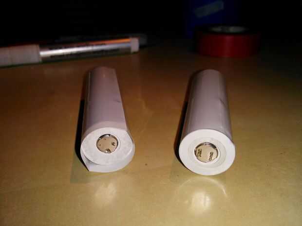 El aislamiento de las células de mi era un poco demasiado delgado para mi gusto, así que decidí en aislarlos aún más. Corté algunos tubería de encogimiento de calor de 29,5 mm diámetro al tamaño de la célula, agregar sobre un centímetro extra. Utilicé una pistola de calor para el embalaje del encogimiento sobre cada una de las tres células.