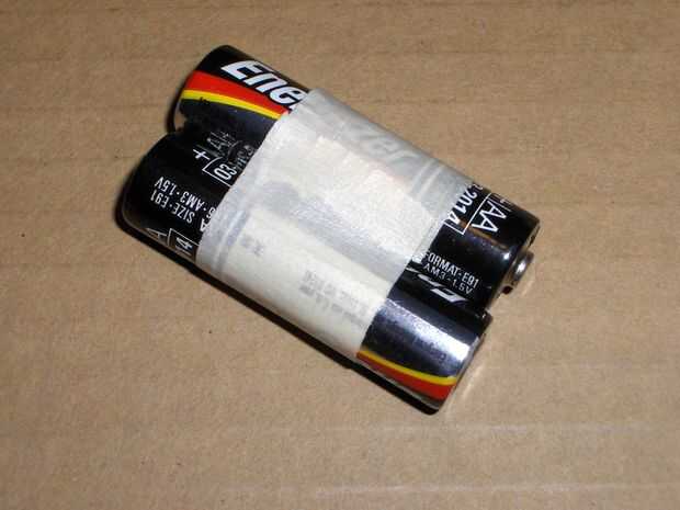 También quieren asociar las dos baterías. Deben ser en direcciones opuestas; así el extremo positivo de una debe estar al lado del extremo negativo del otro. Ayudará si la punta del nudo en el extremo positivo está en el mismo nivel que el extremo plano negativo. Puede utilizar una mesa u otra superficie plana para hasta. Utilice un trozo de cinta para envolverlos juntos.
