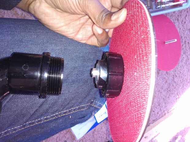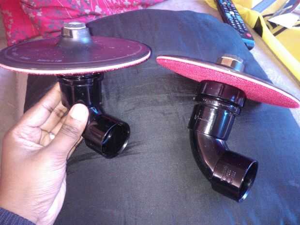 Los tapones de tubo son ideales pues vienen en dos piezas. Uno que encaja en la tubería y el otro que tornillos de cierre al final. Tuve la idea de taladrar un agujero en la tapa entonces poner el tornillo en el disco entonces añadir una tuerca para apretar el tornillo. Manteniendo la tapa firmemente con el disco. Os adjunto la curva de ángulo recto y ve muy bien!
