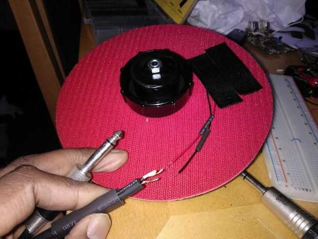 Alambré el piezo a un cable de audio mono. La punta va al cable rojo. He soldado los cables y utiliza del encogimiento del calor para que se vea ordenado. Entonces otra vez usé algunos velcro para mantener seguro el cable. La parte inferior de velcro fue pura suerte y funcionó tan bien.