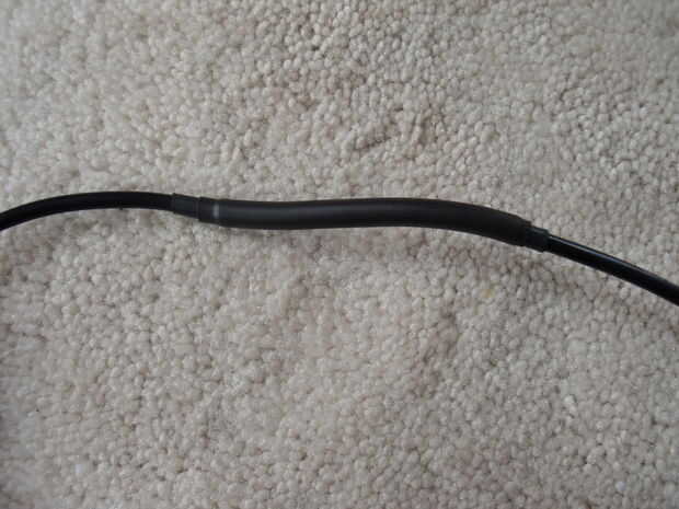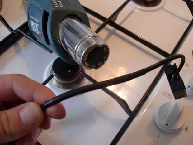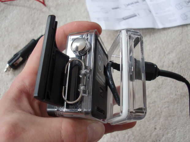 Como la glándula de cable que utiliza no se iba a cerrar lo suficientemente pequeño para sujetar hacia abajo en el cable puse termo retráctil en el cable con el fin de aumentar su espesor. Luego pasa el cable a través de la glándula, dejando suficiente holgura en el interior para permitir que la puerta se abra con el eliminador de batería sigue enchufado en el GoPro. Al cerrar esta bobina de cable ayuda a mantener el GoPro empujado hacia delante en la vivienda.
