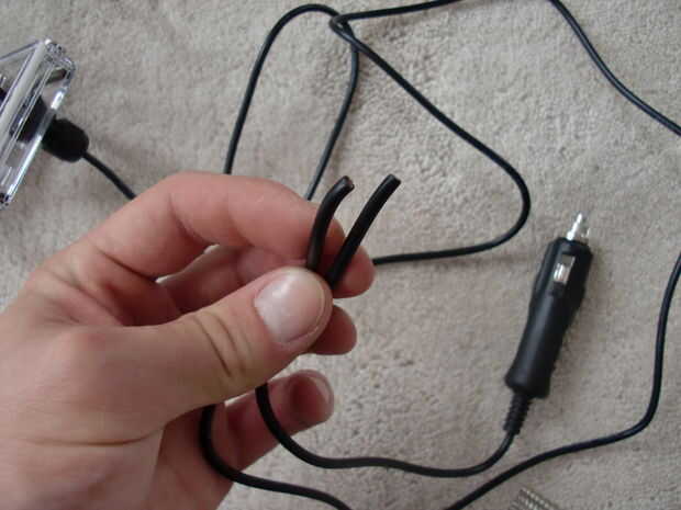 Al cortar el cable hace el corte unos 10cm del enchufe, así permite que el enchufe a una toma de corriente con cable en la misma (ver paso posterior). Una vez que había cortado el cable que usa un multímetro para comprobar la tensión que fue llevada por el cable cuando estaba conectado a una fuente de 12v. Este eliminador de batería particular llevado a 12v y cae la tensión en la pieza que entra en la cámara. Es importante comprobar este paso como si el voltaje caera fue en el cigarrillo enchufe extremo, corte el cable y poner 12v abajo potencialmente podría dañar la cámara.