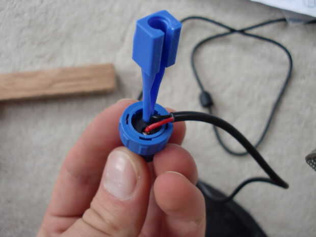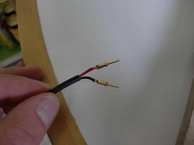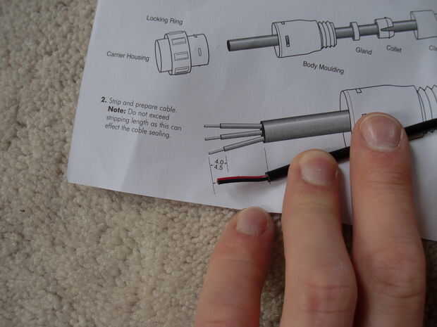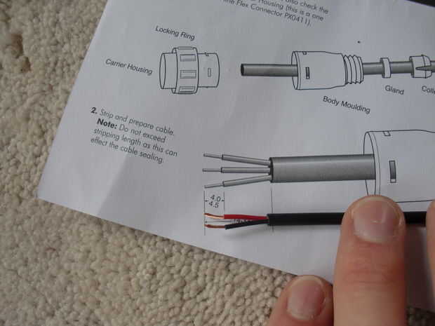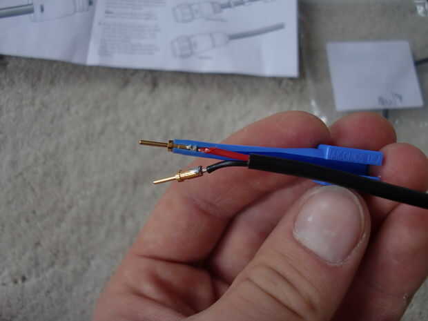 He pelado el cable siguiendo las instrucciones, soldadas a las patillas y luego montar el enchufe juntos. Usted tendrá que decidir en una configuración de pines para utilizar en todos los enchufes y zócalos. Usé dos conectores con patillas uno como positivas y dos negativas. Asegúrese de seguir las instrucciones y montar el enchufe en el orden correcto.