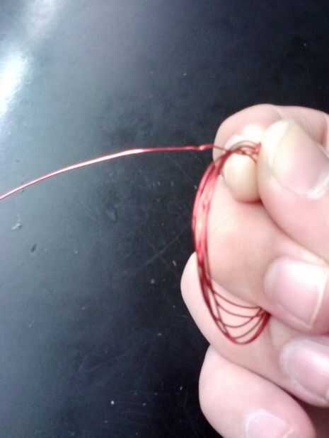 Continueto lazo el extremo del cable de imán detrás a través del orificio hasta que quede una pulgada a la izquierda.