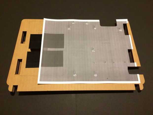 2. Recortar el rectángulo superior derecho y tres rectángulos en la guía de plantilla para que usted puede alinear correctamente la guía de plantilla antes de marcar los agujeros en el cartón detrás. Hay 8 agujeros que deba ser marcado.