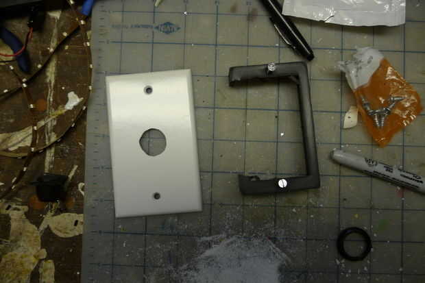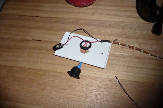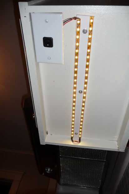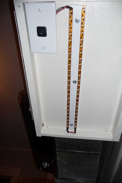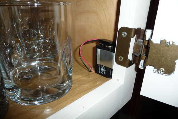 Enrosque el conjunto del interruptor de la luz a través de la placa y la tuerca de plástico que viene con el interruptor. Esto se tiene que hacer antes de pegar las tiras de LED. Apriete la tuerca para presionado el interruptor a la placa, empuje el conector de la batería a través del orificio en la parte inferior del gabinete y atornillar la tapa a la extensión de la batería.