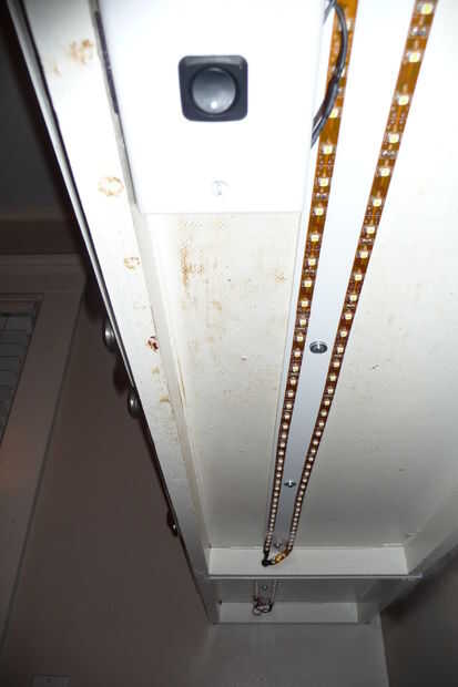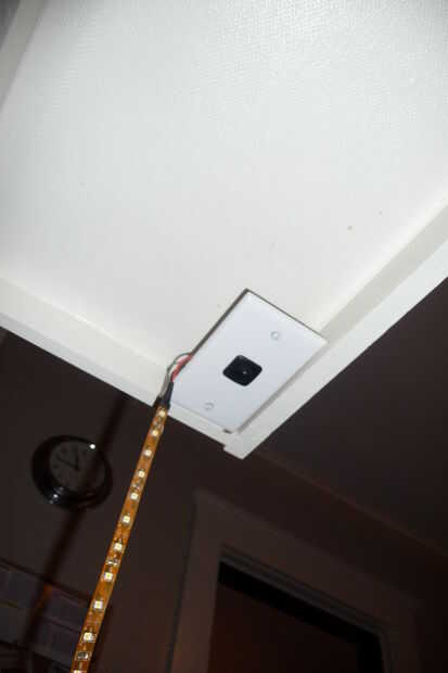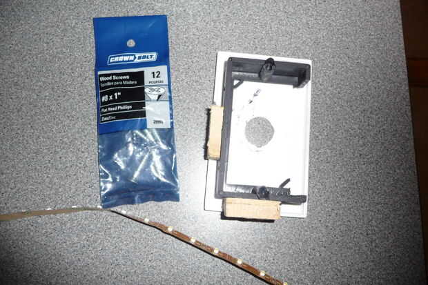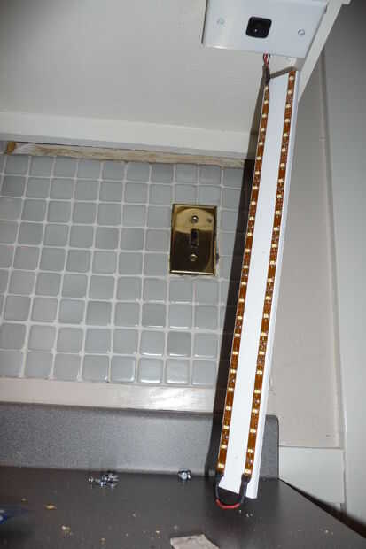 Una vez que el montaje de la caja, interruptor y las luces han estado vinculado a los gabinetes es hora de pegar las luces en el lugar. Si la parte inferior de los gabinetes es lisa puede capaz de pegar la cinta directamente a ellos. Mina eran áspera, así que primero pegué las tiras de la luz una pieza de PVC. A partir de cerca de la caja de interruptor pelar unas cuantas pulgadas a la vez y presione firmemente hasta el borde del PVC. Trabajé todo el camino hacia abajo de un lado, hizo la vuelta y regresó. Deje más espacio entre las tiras paralelas para sujetar en la parte inferior de los gabinetes.