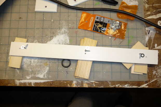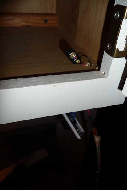 Cuando planeaba este yo no cuenta para la placa frontal es más ancho que el extensor de caja; Esto era un problema porque esperaba a enroscar el lados del extensor de caja directamente a la falda gabinete. Terminé caliente pegando calzas un par a cada lado del extensor para que toda la Asamblea se descanse firmemente contra los gabinetes cuando. ¡ Pretaladrados en la falda gabinete y adjunta el extensor con tornillos para madera - tenga muy cuidado de no ir a través de todo el camino! El tercer tornillo, en el lado corto de la extensión era necesario, sin ella la placa del interruptor y la tapa tendría demasiado movimiento.