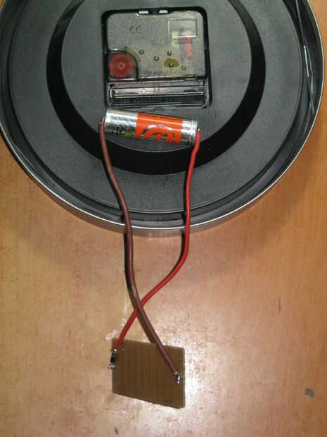 Hay solamente un diodo de Schottky 1N5819 en el circuito de alimentación del panel a la batería durante el día y evitar cualquier corriente de fuga durante la noche. La potencia entregada a la carga (aquí un reloj) está regulada por la batería y aunque la potencia del panel es bastante baja, el reloj de voltaje recibe apenas ir arriba 1.3V que es perfectamente aceptable para mi reloj de pared baratos de China.